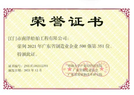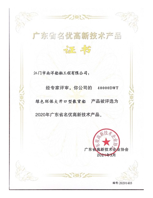 ![]() On March 2021, JNS 40000DWT green bulk carrier was recognized as high-tech product. On May 2021,JNS has successfully delivered the 80th vessel Hull no.JNS179. ![]() On Dec 30,2021,JNS awarded Top 500 Manufacturing Enterprises of Guangdong 2021. ![]() On Oct 10 ,2021,JNS approved National High and New Tech Enterprise for four time. ![]() On November 30,2022,JNS awarded Top 500 Manufacturing Enterprises of Guangdong 2022. |