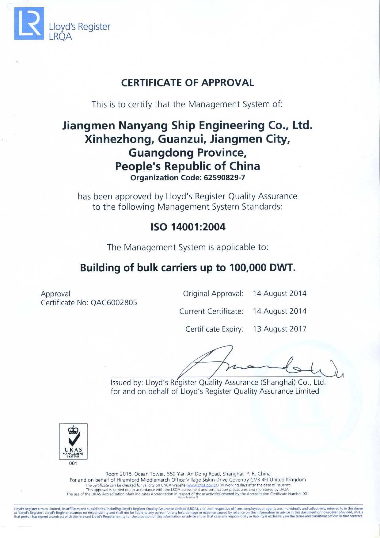 JNS has been approved by LR to ISO14001:2004 Management System Standard