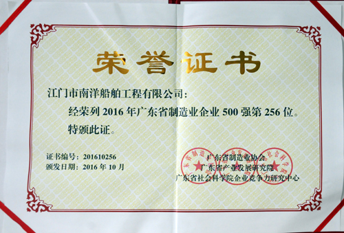 Zhuhai, Oct. 13, 2016 –JNS, a shipbuilding manufacturer, today received the award of Top 500 Manufacturing Enterprises of Guangdong 2016.