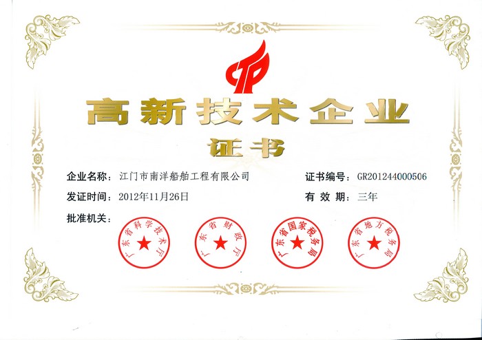2012年11月26日,江門市南洋船舶工程有限公司(以下簡稱“南洋船舶”)獲得“國家高新技術(shù)企業(yè)”認(rèn)定。近日,南洋船舶正式獲頒高新技術(shù)企業(yè)證書和匾牌,這也是南洋船舶自2011年9月5日被認(rèn)定為廣東省省級企業(yè)技術(shù)中心以來的又一極大的突破。