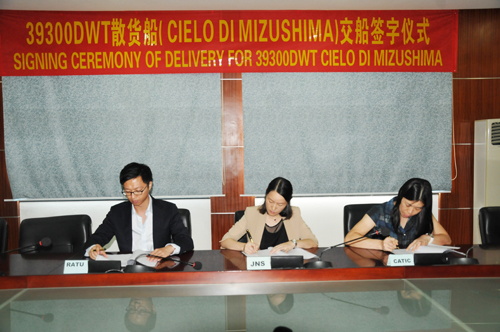 2016年9月28日上午,江門市南洋船舶工程有限公司舉辦了39300DWT散貨船JNS148船的交船簽字儀式,船東、貿(mào)易公司和我司三方代表出席。