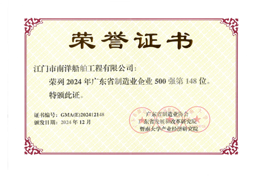2024年12月3日,由廣東省制造業(yè)協(xié)會(huì)、暨南大學(xué)產(chǎn)業(yè)經(jīng)濟(jì)研究院及廣東省發(fā)展和改革研究院聯(lián)合發(fā)布《2024年廣東制造業(yè)500強(qiáng)企業(yè)研究報(bào)告》。該報(bào)告依據(jù)企業(yè)的年度營業(yè)收入及多項(xiàng)關(guān)鍵指標(biāo),評(píng)選出廣東省制造業(yè)500強(qiáng)企業(yè)。公司作為全球小靈便型散貨船建造領(lǐng)先企業(yè),再次榮列2024年廣東省制造業(yè)500強(qiáng)企業(yè)榜單,位列第148位。